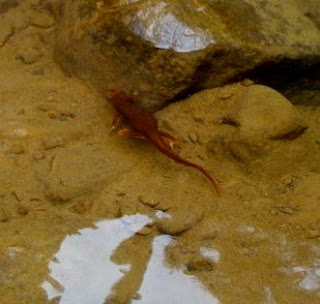 a salamander!  I watched it for a while and it was swimming/crawling/moving around okay, so I don't *think* she smooshed it.  She saw me watching and started to stomp after it again, but I was able to get her to leave it alone.  We went back to Garin today and walked the other direction on the trail.  She still checked out every stream access point she could and I wandered down with her.  I was able to see 2 or 3 of these little guys at each point we stopped at.  Pretty cool.  Oh!  I also saw a fox out there today.  And some wild turkey.  And of course....cows.  But they left us alone, and we returned the favor.